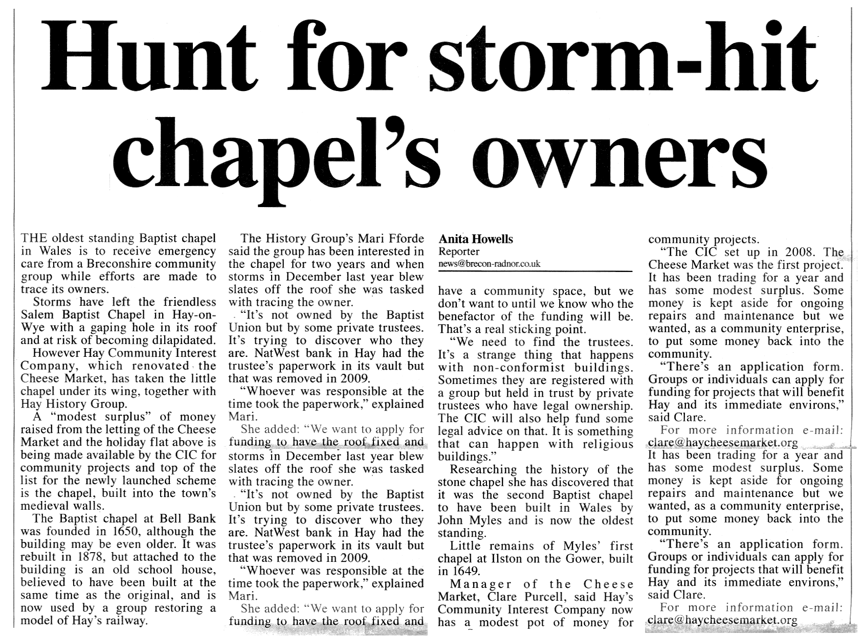 Note 4: A report on Salem Chapel appeared in the Brecon and Radnor Express dated 4 February 2016. The report describes attempts being made to trace the ownership of the chapel before repair work is authorised to rectify storm damage to the roof of the chapel. The full report is provided below (click on the image to enlarge to full size).